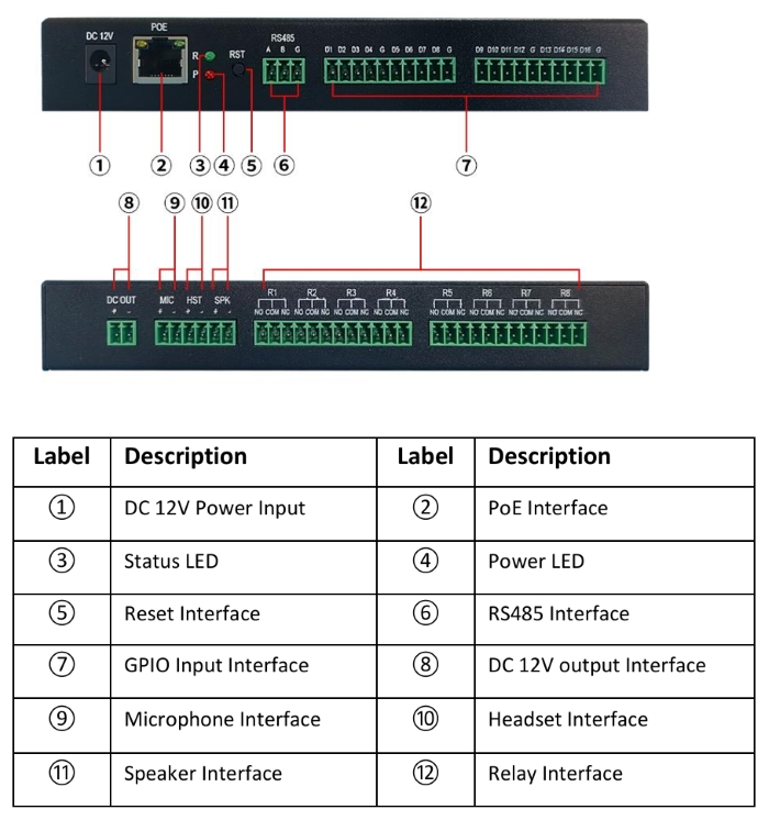 1 × MIC入力、1 × ヘッドセット出力、1 × スピーカー出力、8 × リレー、16 × GPIOアラーム入力、1 × DC出力、1 × RS485、1 × リセット |